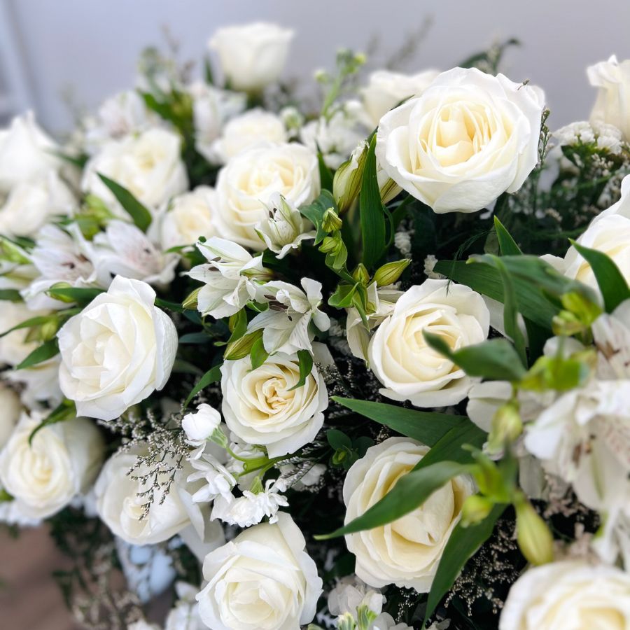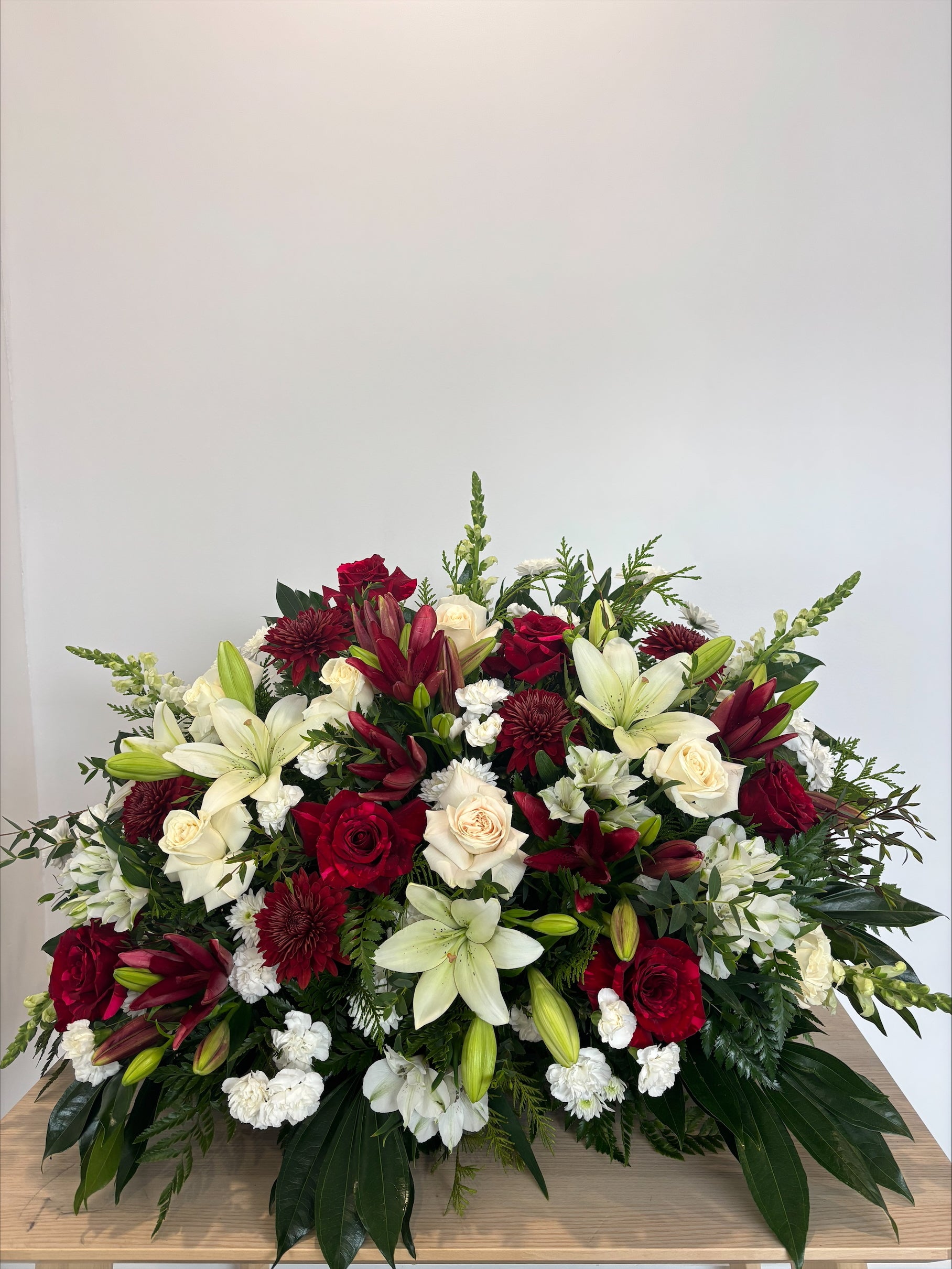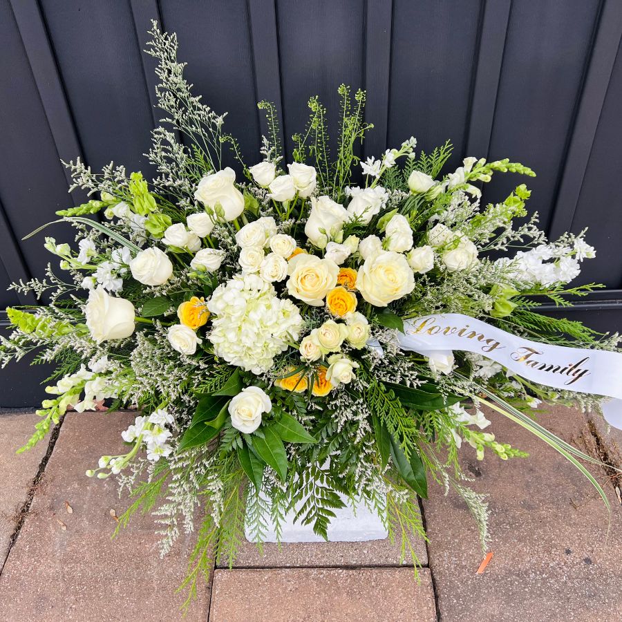 The Casket Spray is a deeply meaningful and prominent tribute, gracefully adorning the casket as a final, beautiful gesture of love and remembrance for your cherished loved one. Our florists hand-select and artfully design this expansive arrangement using the freshest seasonal blooms and lush foliage, crafting a heartfelt expression that can be fully personalized to reflect the unique life and spirit of the deceased. You can specify a preferred color scheme or work with our designers to choose tones and textures that truly honor their memory.