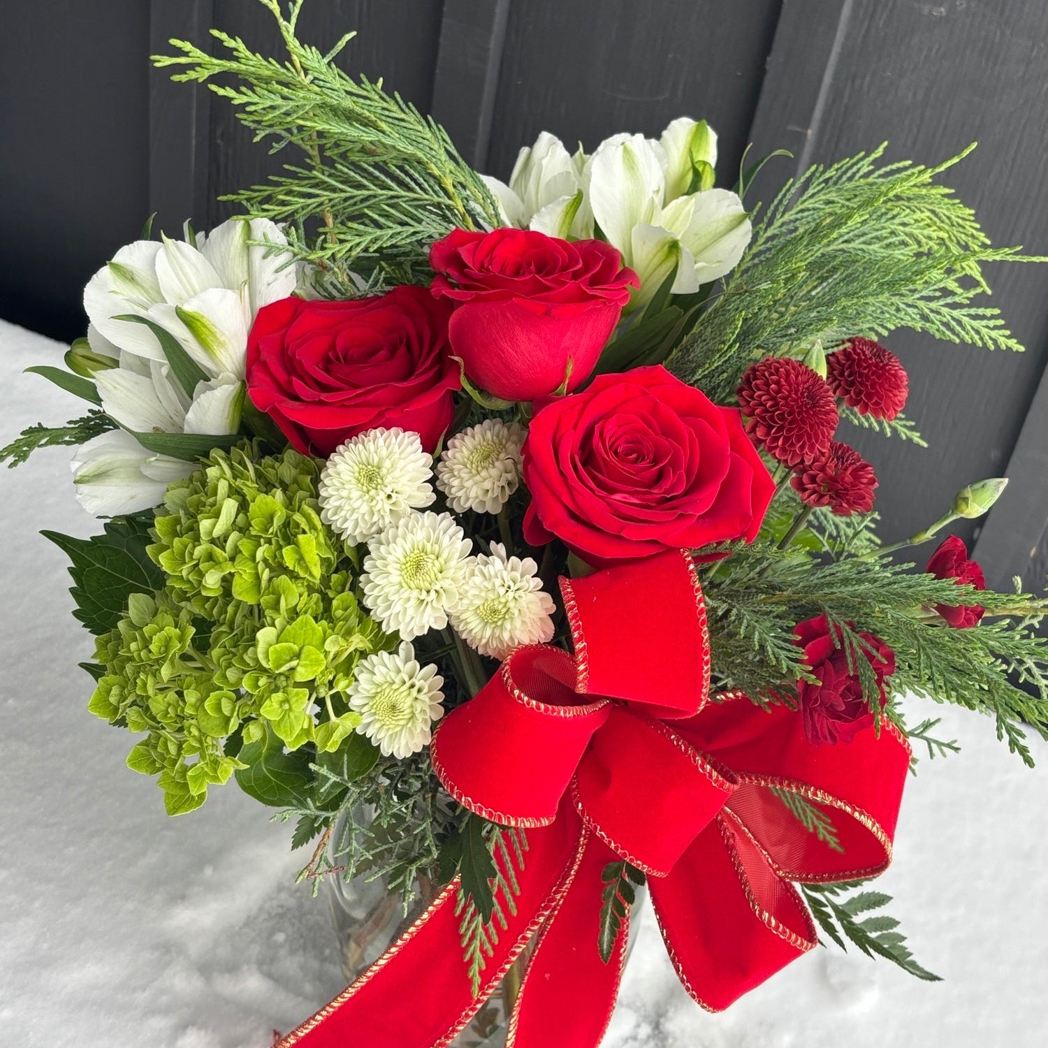 Bright, joyful, and full of classic Christmas Charm, this arrangement features vibrant red roses, white alstroemeria, green hydrangea, and soft seasonal mums. Fresh winter greens add texture and fragrance, while the bold holiday bow gives the perfect festive finish. Designed in a clear glass vase, this piece brings warmth and elegance to any home, making it a beautiful gift or holiday decor accent.