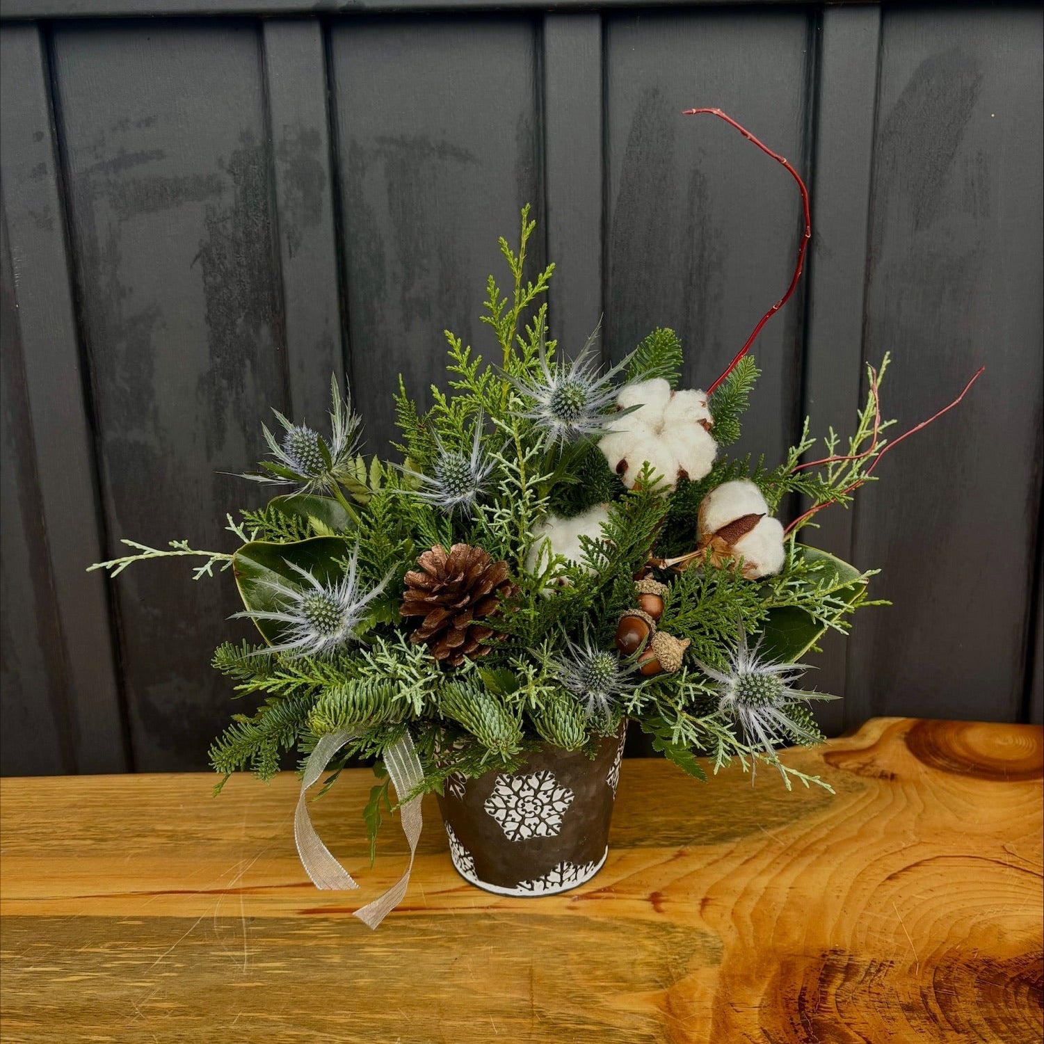 Soft, snowy, and elegant. Our Northern Charm blends fresh winter greens, cotton, pinecones, and subtle natural accents for a clean, Nordic-inspired look. Designed in a charming textured container, this arrangement adds a peaceful winter glow to tables, entryways, or gift deliveries.