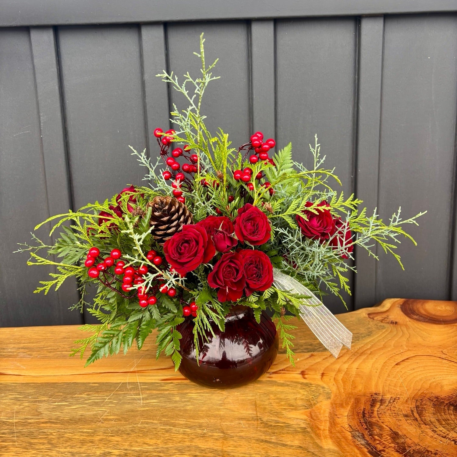 A festive favorite with a pop of holiday red. Ruby Glow features rich ruby-toned blooms, fresh winter evergreens, pinecones, and hints of silver or gold. Styled in a beautiful ruby glass vase, it is the perfect gift for the season.