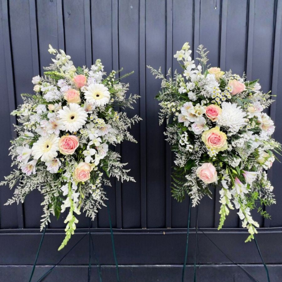 The Spray Duo offers a grand and graceful tribute, consisting of a magnificent, matched pair of floral arrangements designed for maximum impact. Each large standing spray is crafted with a harmonious blend of premium seasonal blooms—featuring gentle pinks, crisp whites, and delicate greens—and is thoughtfully curated to provide a symmetrical focal point that conveys deep reverence, enduring love, and comfort during a funeral service or viewing. This coordinated pair symbolizes lasting unity and provides a powerful gesture of remembrance.
