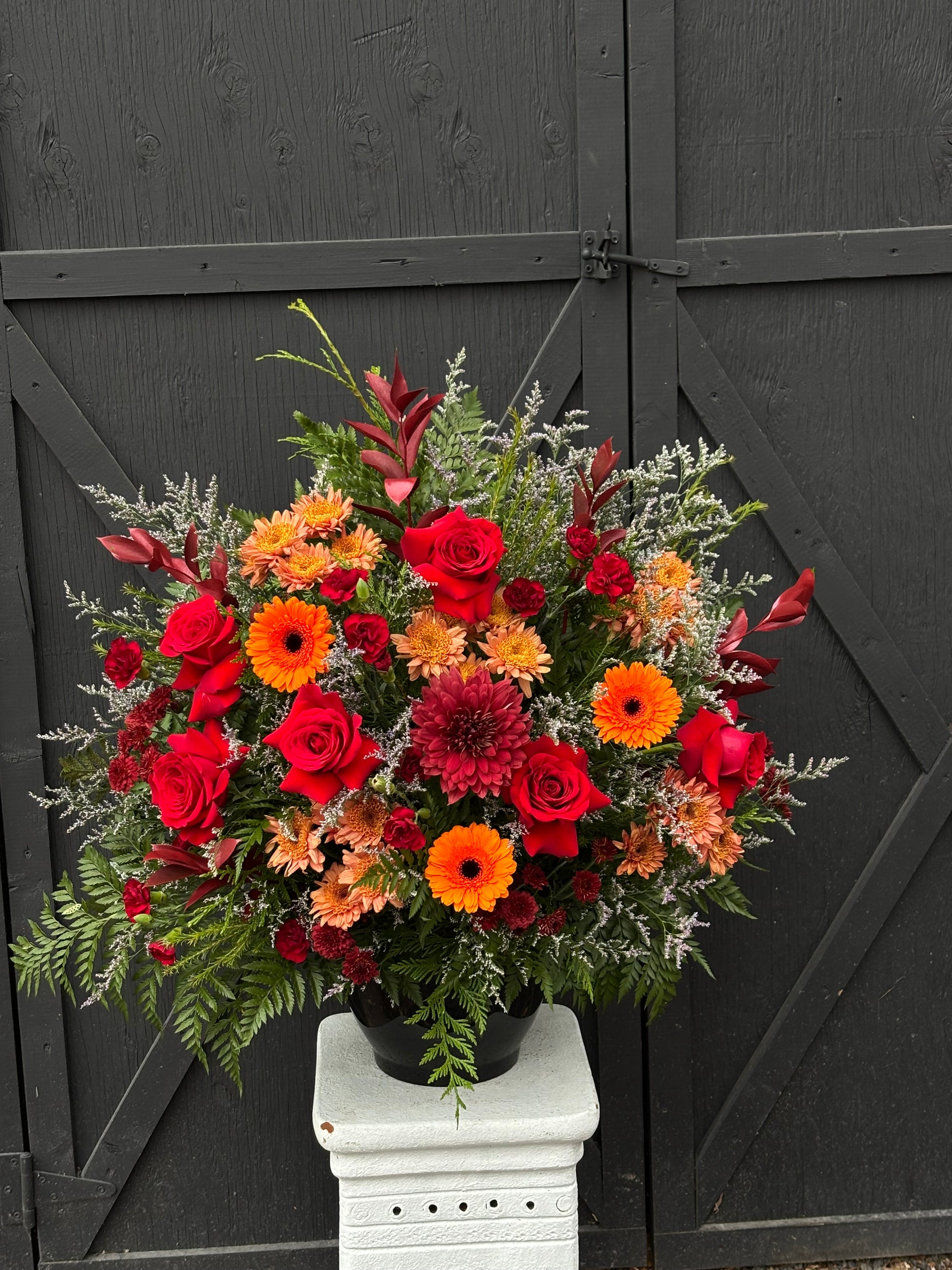 The Ceramic & Vase Spray is a beautifully tall, statement-making floral tribute, thoughtfully designed to honor your loved one with unique grace and presence. This fresh floral spray is expertly arranged in a substantial ceramic container or decorative vase, giving it a dignified, grounded appearance perfect for display on a pedestal or floor. The design features a modern asymmetrical shape that adds visual interest and is complemented by a generous amount of lush, textural, and often tropical foliage. Crafted with the best seasonal blooms available, this magnificent piece is fully customizable—simply specify your desired color scheme to create a deeply personal and appropriate expression of remembrance.