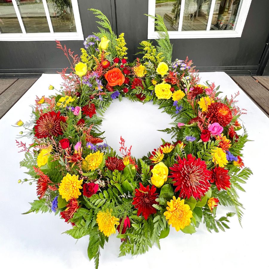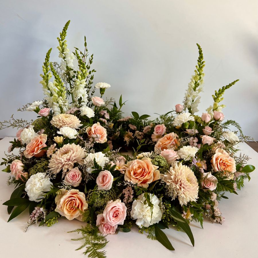 The Urn Spray is a beautifully serene and heartfelt funeral piece, thoughtfully designed with elegant, garden-inspired styling to create a loving, natural frame around the urn. Crafted with the utmost care and sensitivity, this circular arrangement combines an abundance of lush, trailing seasonal foliage and expressive, hand-selected blooms. This spray is a deeply personal expression of love, symbolizing the eternal nature of life and memory while providing a comforting, beautiful focal point for the memorial or service.