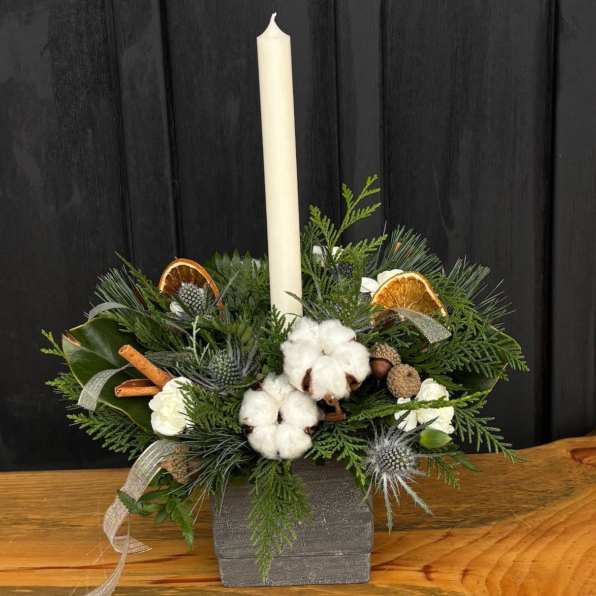Lush seasonal evergreens, soft cotton accents, and natural textural elements designed in a rustic ceramic or wooden container. Warm, woodsy, and wonderfully cozy- this arrangement is perfect for adding a touch of nature to any space.